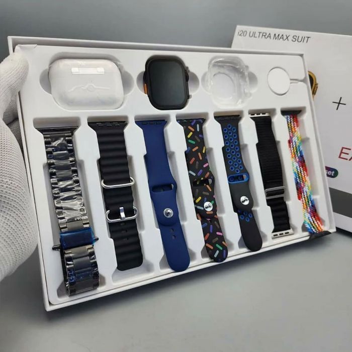 Upgrade your lifestyle with the I20 Ultra Max Suit, a complete smart combo set including a premium smartwatch, wireless earbuds, and multiple stylish straps for every occasion. Perfect for daily use, fitness, and smart connectivity.